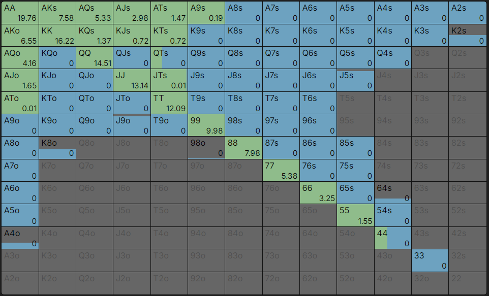Podemos ver que el limite para pagar lo tiene en manos como ATo o A9s, tambien paga KTs y KJs, asi como 55 en cuanto a parejas.