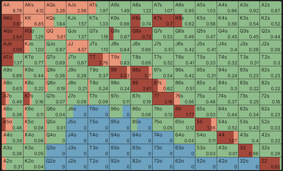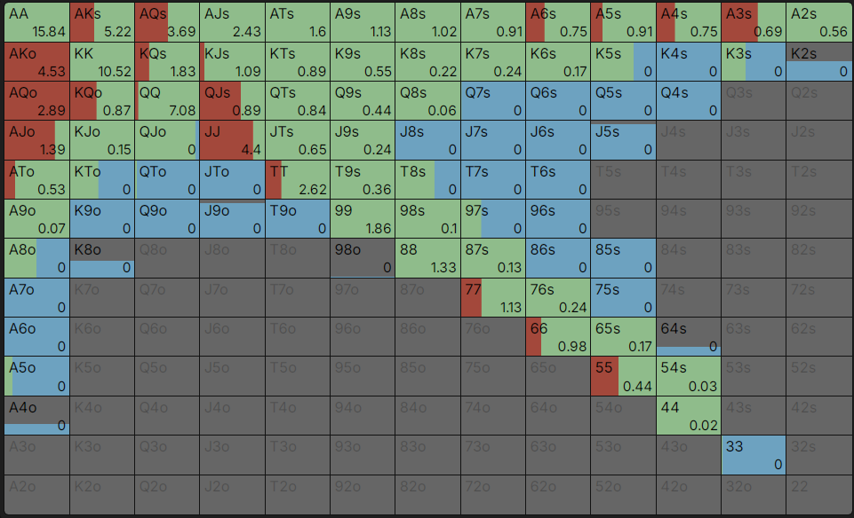 Aqui vemos el rango de 3bet por parte de BB VS BTN, como vemos contiene manos de farol como T9s, 89s, 78s, los Kx suited y algunos Ax off, por lo que si el rival tiene menos de ese 16% es posible que su rango de 3bet no contenga estos combos de farol y su 3bet sea puro value,